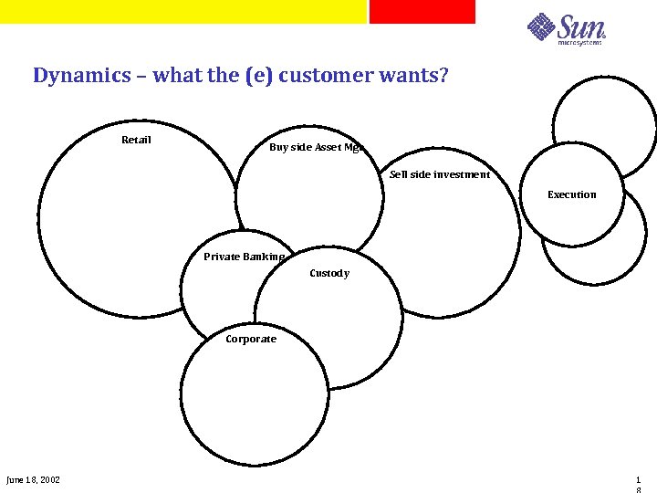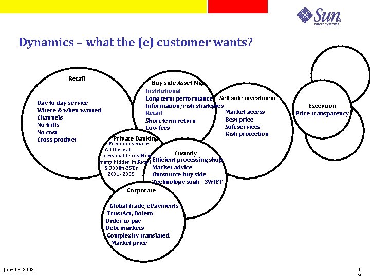 Dynamics – what the (e) customer wants? Retail Buy side Asset Mgt Sell side investment Execution Private Banking Custody Corporate June 18, 2002 1