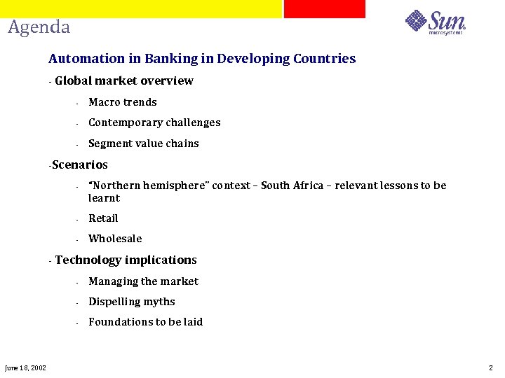 Agenda Automation in Banking in Developing Countries - Global market overview - Macro trends - Contemporary challenges - Segment value chains -Scenarios - “Northern hemisphere” context – South Africa – relevant lessons to be learnt - Retail - Wholesale - Technology implications - Dispelling myths - June 18, 2002 Managing the market Foundations to be laid 2