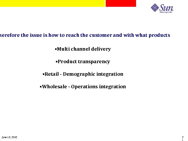 herefore the issue is how to reach the customer and with what products • Multi channel delivery • Product transparency • Retail - Demographic integration • Wholesale - Operations integration June 18, 2002 2