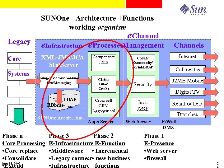 …. Through the looking glass …. architecture Legacy Core Systems SUNOne - Architecture +Functions working organism e. Channel e. Infrastructure e. Processes. Management XML-JMS/JCA SInt. Server Integration/Information Bus/Messaging LDAP RDbms SUNOne Architecture Phase n Core Processing • Core replace • Consolidate June 18, 2002 • Extend Components J 2 EE Collab/ Community/ portal/LDAP Claims Loans Credit Security Cross sell CRM Aggregationl Java J 2 SE Apps Server Channels Internet Call centre J 2 ME Mobile Digital TV Web Server Phase 3 Phase 2 E-Infrastructure E-Function • Middleware • Incremental • Legacy connect • new business • Infrastructure functions Retail outlets Branches F/Wall. DMZ Phase 1 E-Presence • Web server • firewall 2