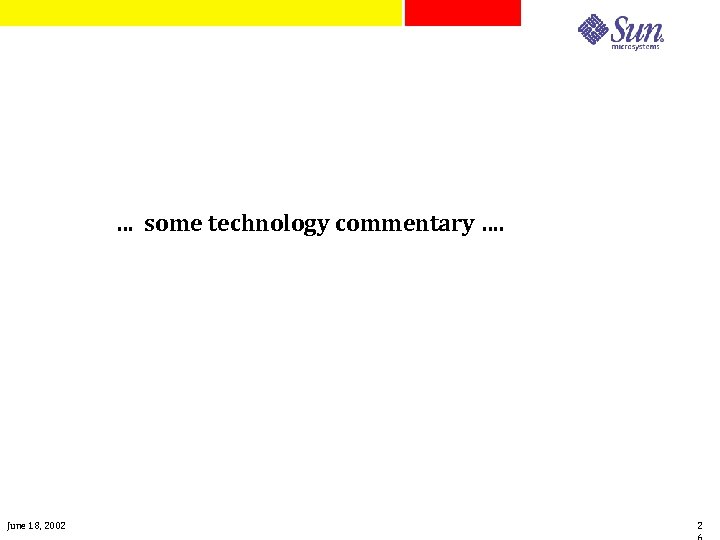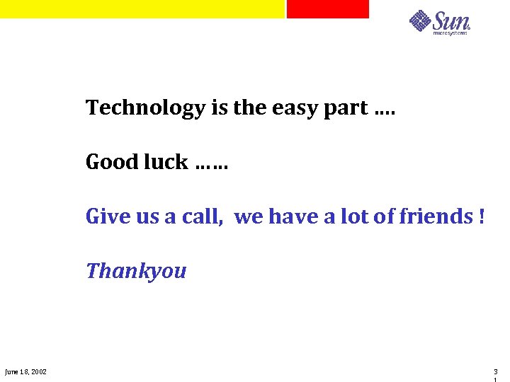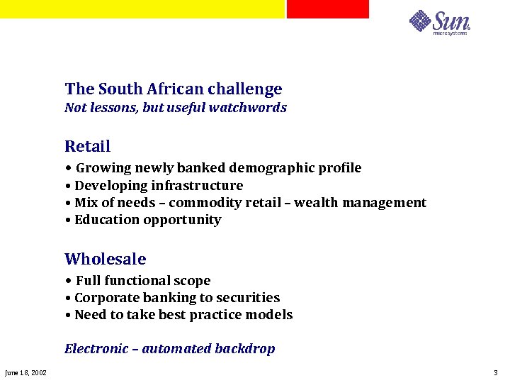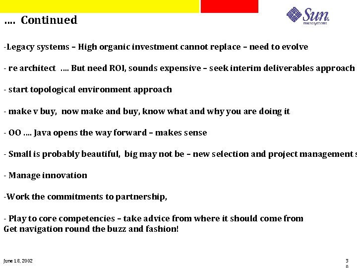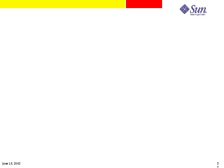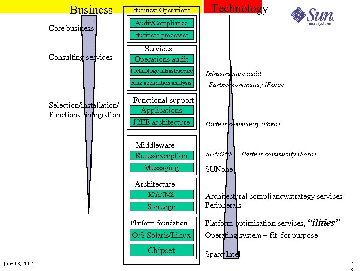 Business Core business Consulting services Business Operations Audit/Compliance Business processes Services Operations audit Technology infrastructure Risk application analysis Selection/installation/ Functional integration Technology Functional support Applications J 2 EE architecture Middleware Rules/exception Messaging Infrastructure audit Partner community i. Force SUNONE + Partner community i. Force SUNone Architecture JCA/JMS Storedge Platform foundation O/S Solaris/Linux Chipset June 18, 2002 Architectural compliancy/strategy services Peripherals Platform optimisation services, “ilities” Operating system – fit for purpose Sparc/Intel 2