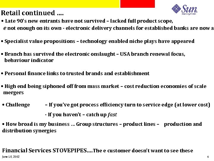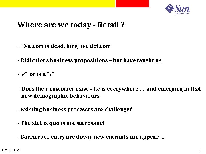 Where are we today - Retail ? - Dot. com is dead, long live dot. com - Ridiculous business propositions – but have taught us -“e” or is it “i” - Does the e customer exist – he is everywhere … and emerging in RSA new demographic behaviours - Existing business processes are challenged - The status quo is not sacrosanct - Barriers to entry are down, new entrants can appear …. June 18, 2002 5