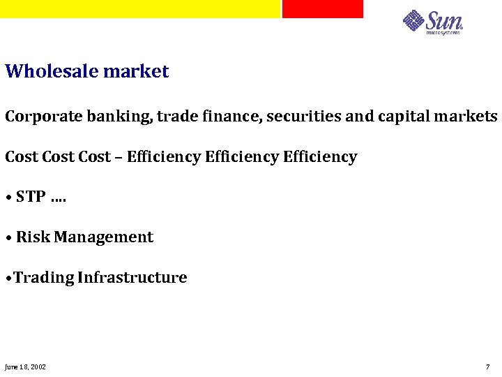 Wholesale market Corporate banking, trade finance, securities and capital markets Cost – Efficiency • STP …. • Risk Management • Trading Infrastructure June 18, 2002 7