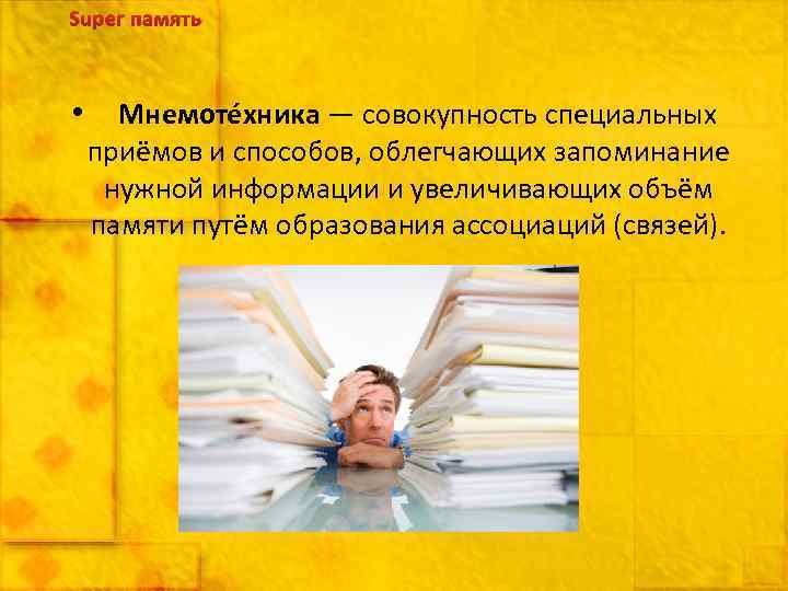 Super память • Мнемоте хника — совокупность специальных приёмов и способов, облегчающих запоминание нужной информации и увеличивающих объём памяти путём образования ассоциаций (связей).