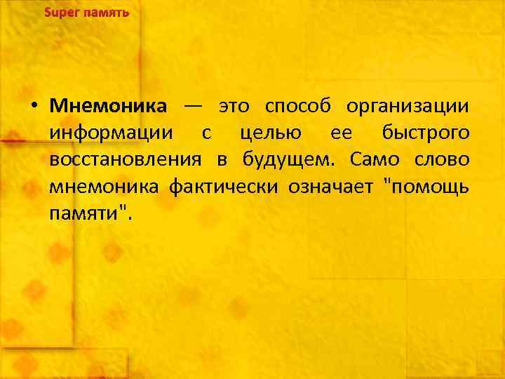 Super память • Мнемоника — это способ организации информации с целью ее быстрого восстановления в будущем. Само слово мнемоника фактически означает "помощь памяти".