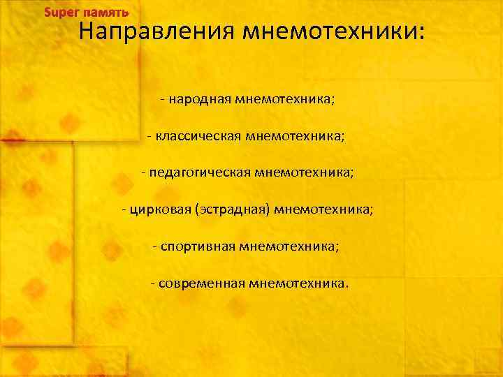 Super память Направления мнемотехники: - народная мнемотехника; - классическая мнемотехника; - педагогическая мнемотехника; - цирковая (эстрадная) мнемотехника; - спортивная мнемотехника; - современная мнемотехника.