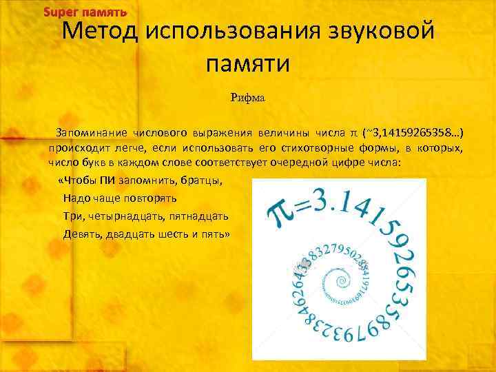 Super память Метод использования звуковой памяти Рифма Запоминание числового выражения величины числа π (~3, 14159265358…) происходит легче, если использовать его стихотворные формы, в которых, число букв в каждом слове соответствует очередной цифре числа: «Чтобы ПИ запомнить, братцы, Надо чаще повторять Три, четырнадцать, пятнадцать Девять, двадцать шесть и пять»