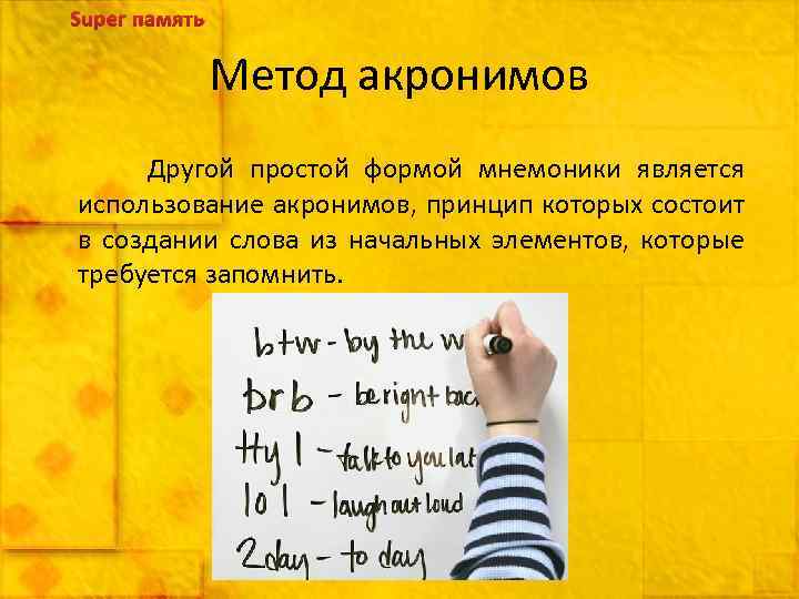 Super память Метод акронимов Другой простой формой мнемоники является использование акронимов, принцип которых состоит в создании слова из начальных элементов, которые требуется запомнить.