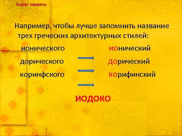 Super память Например, чтобы лучше запомнить название трех греческих архитектурных стилей: ионического дорического коринфского ионический дорический корифинский ИОДОКО