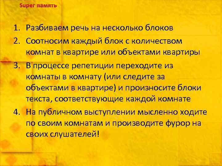 Super память 1. Разбиваем речь на несколько блоков 2. Соотносим каждый блок с количеством комнат в квартире или объектами квартиры 3. В процессе репетиции переходите из комнаты в комнату (или следите за объектами в квартире) и произносите блоки текста, соответствующие каждой комнате 4. На публичном выступлении мысленно ходите по своим комнатам и производите фурор на своих слушателей!