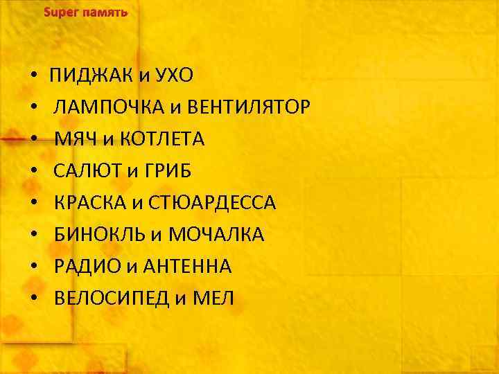 Super память • • ПИДЖАК и УХО ЛАМПОЧКА и ВЕНТИЛЯТОР МЯЧ и КОТЛЕТА САЛЮТ и ГРИБ КРАСКА и СТЮАРДЕССА БИНОКЛЬ и МОЧАЛКА РАДИО и АНТЕННА ВЕЛОСИПЕД и МЕЛ