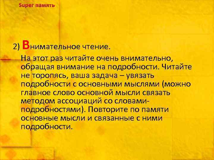 Super память 2) Внимательное чтение. На этот раз читайте очень внимательно, обращая внимание на подробности. Читайте не торопясь, ваша задача – увязать подробности с основными мыслями (можно главное слово основной мысли связать методом ассоциаций со словамиподробностями). Повторите по памяти основные мысли и связанные с ними подробности.