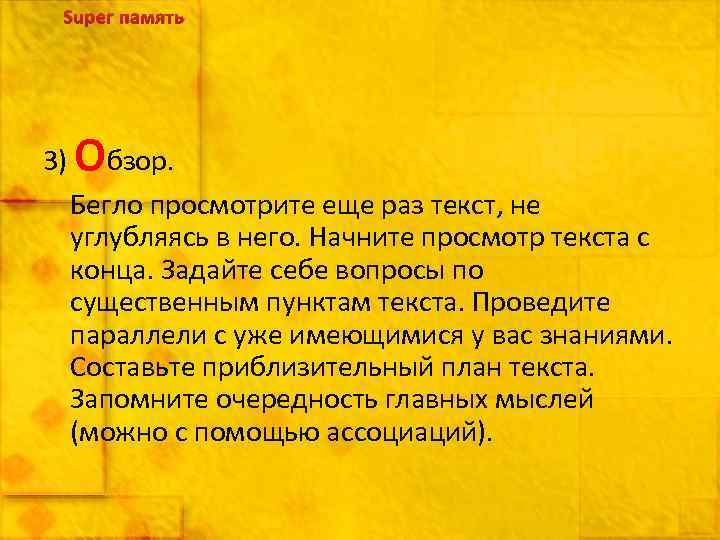 Super память 3) Обзор. Бегло просмотрите еще раз текст, не углубляясь в него. Начните просмотр текста с конца. Задайте себе вопросы по существенным пунктам текста. Проведите параллели с уже имеющимися у вас знаниями. Составьте приблизительный план текста. Запомните очередность главных мыслей (можно с помощью ассоциаций).
