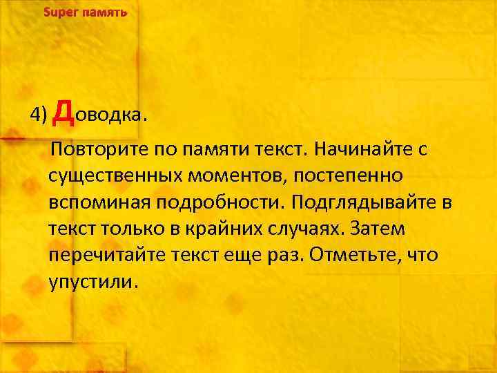 Super память 4) Доводка. Повторите по памяти текст. Начинайте с существенных моментов, постепенно вспоминая подробности. Подглядывайте в текст только в крайних случаях. Затем перечитайте текст еще раз. Отметьте, что упустили.