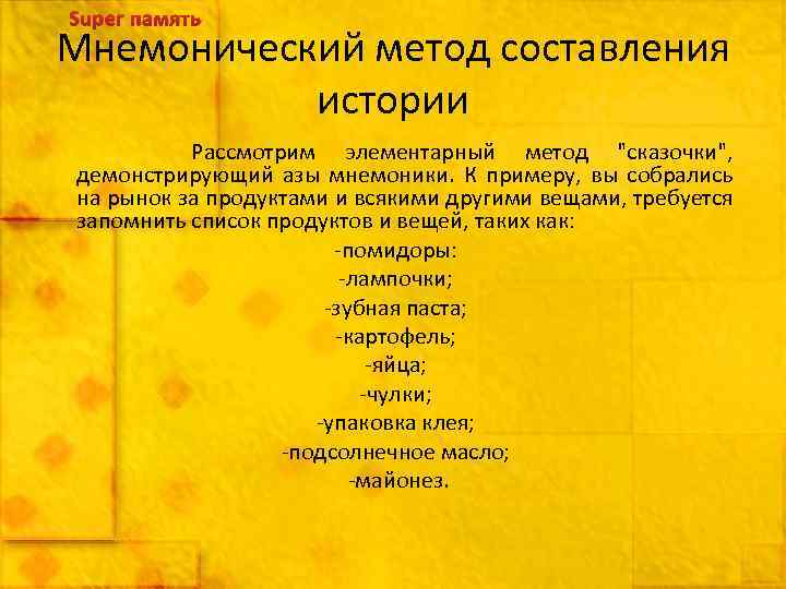 Super память Мнемонический метод составления истории Рассмотрим элементарный метод "сказочки", демонстрирующий азы мнемоники. К примеру, вы собрались на рынок за продуктами и всякими другими вещами, требуется запомнить список продуктов и вещей, таких как: -помидоры: -лампочки; -зубная паста; -картофель; -яйца; -чулки; -упаковка клея; -подсолнечное масло; -майонез.