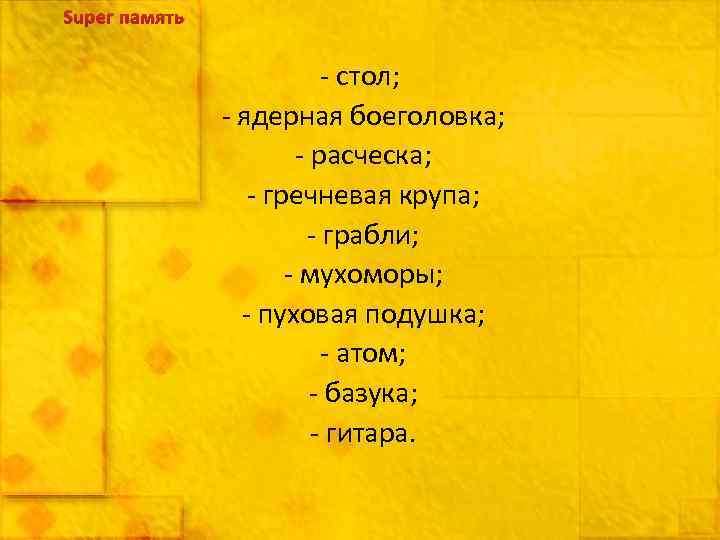 Super память - стол; - ядерная боеголовка; - расческа; - гречневая крупа; - грабли; - мухоморы; - пуховая подушка; - атом; - базука; - гитара.