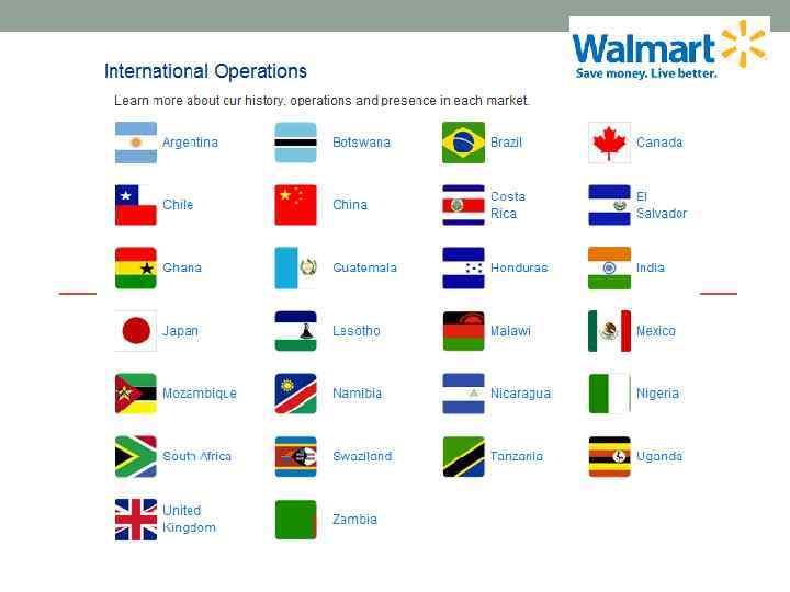 • AFRICA: Walmart acquired a majority stake in Massmart Holdings Limited, the leading African retailer of general merchandise, home mprovement equipment and supplies, that comprises nine wholesale and retail chains, and one buying group, operating in 13 countries in Sub. Saharan Africa. • Total retail units, 2012: 347 • GUATEMALA: Acquired 33 percent interest in Central American Retail Holding Company (CARHCO) from the Dutch retailer Royal Ahold NV. In March 2006, they increased the interest to 51 percent and the CARHCO name became Walmart Centroamérica. • Total Retail Units, 2012: 200 • MEXICO: Joint venture with Cifra to open a Sam’s Club in Mexico City. Then, acquired a majority of Cifra, and in February 2000, the Cifra name officially changed to Walmart de México (WALMEX). • Total Retail Units 2012: 2, 088