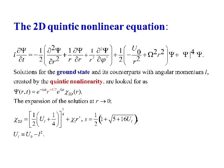 The effect of the additional harmonic trapping potential (Ω² > 0) in the 2 D case In the case of - ¼ < U 0 < 0 , the addition of the harmonic trap to the 2 D quintic equation creates two extra bound states, which represent the nonlinear deformation of the two eigenstates which were found as exact solutions to the linear 2 D Schrödinger equation. There also remains the ground state created by the quintic nonlinearity, which is distorted by the harmonic potential, Ω²r²/2.