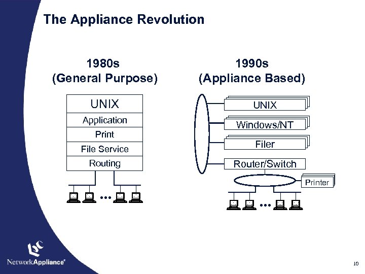 The Appliance Revolution 1980 s (General Purpose) 1990 s (Appliance Based) UNIX Application Windows/NT Print File Service Filer Routing Router/Switch . . . Printer . . . 10