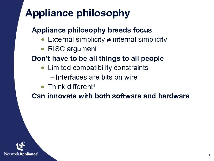Appliance philosophy breeds focus · External simplicity internal simplicity · RISC argument Don’t have to be all things to all people · Limited compatibility constraints - Interfaces are bits on wire · Think different! Can innovate with both software and hardware 11