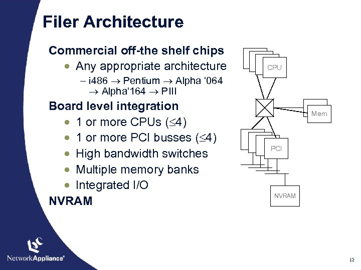 Filer Architecture Commercial off-the shelf chips · Any appropriate architecture CPU - i 486 Pentium Alpha ‘ 064 Alpha‘ 164 PIII Board level integration · 1 or more CPUs ( 4) · 1 or more PCI busses ( 4) · High bandwidth switches · Multiple memory banks · Integrated I/O NVRAM Mem PCI NVRAM 12