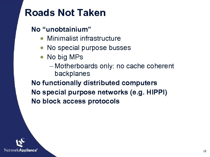 Roads Not Taken No “unobtainium” · Minimalist infrastructure · No special purpose busses · No big MPs - Motherboards only: no cache coherent backplanes No functionally distributed computers No special purpose networks (e. g. HIPPI) No block access protocols 13