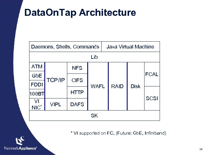 Data. On. Tap Architecture Daemons, Shells, Commands Java Virtual Machine Lib ATM Gb. E FDDI 100 BT VI NIC* NFS TCP/IP FCAL CIFS WAFL RAID Disk HTTP SCSI VIPL DAFS SK * VI supported on FC, (Future: Gb. E, Infiniband) 14