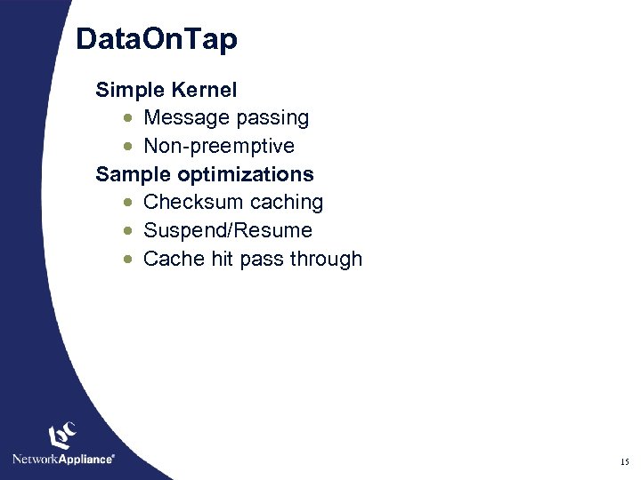 Data. On. Tap Simple Kernel · Message passing · Non-preemptive Sample optimizations · Checksum caching · Suspend/Resume · Cache hit pass through 15