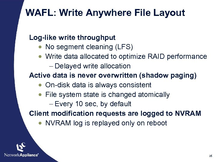 WAFL: Write Anywhere File Layout Log-like write throughput · No segment cleaning (LFS) · Write data allocated to optimize RAID performance - Delayed write allocation Active data is never overwritten (shadow paging) · On-disk data is always consistent · File system state is changed atomically - Every 10 sec, by default Client modification requests are logged to NVRAM · NVRAM log is replayed only on reboot 16