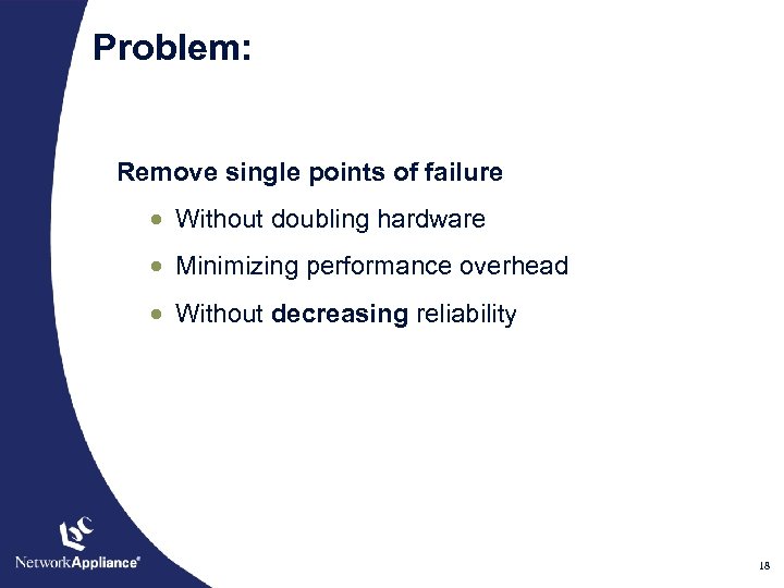 Problem: Remove single points of failure · Without doubling hardware · Minimizing performance overhead · Without decreasing reliability 18