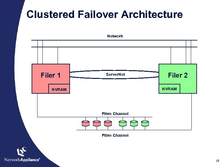 Clustered Failover Architecture Network Filer 1 Server. Net Filer 2 NVRAM Fibre Channel 19