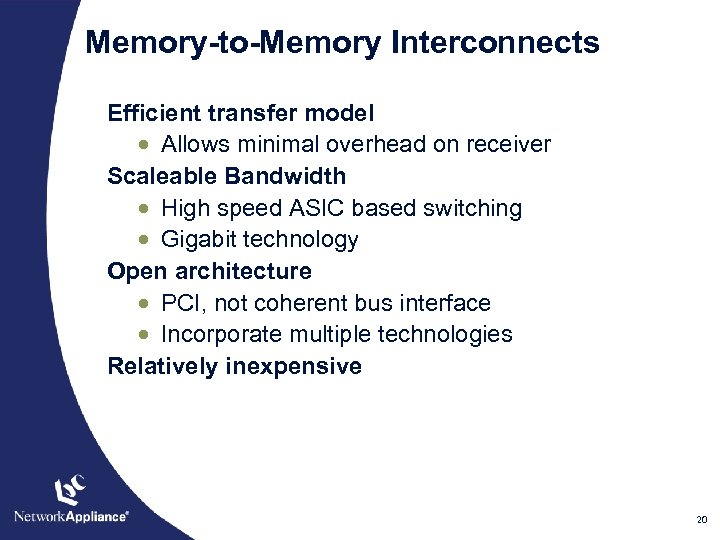 Memory-to-Memory Interconnects Efficient transfer model · Allows minimal overhead on receiver Scaleable Bandwidth · High speed ASIC based switching · Gigabit technology Open architecture · PCI, not coherent bus interface · Incorporate multiple technologies Relatively inexpensive 20