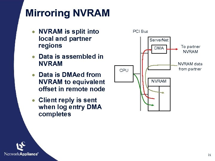 Mirroring NVRAM · NVRAM is split into local and partner regions PCI Bus Server. Net DMA · Data is assembled in NVRAM · Data is DMAed from NVRAM to equivalent offset in remote node To partner NVRAM data from partner CPU NVRAM · Client reply is sent when log entry DMA completes 21