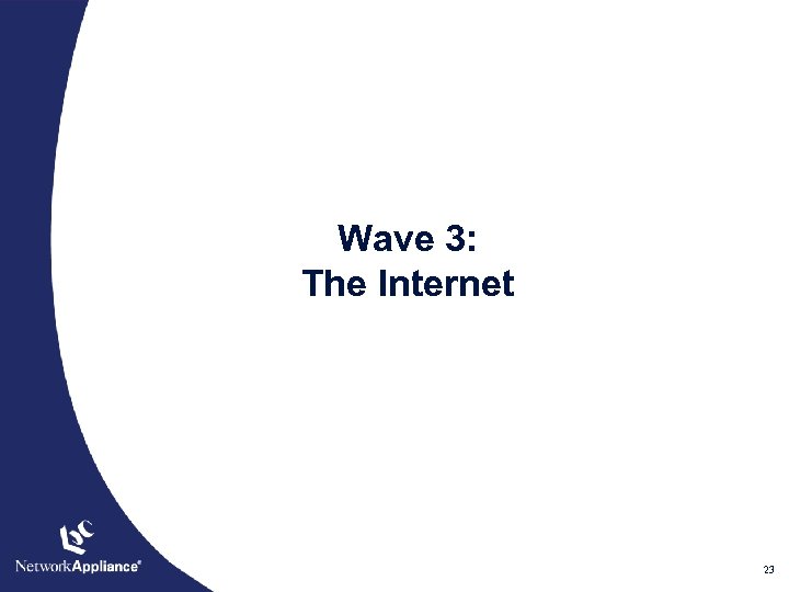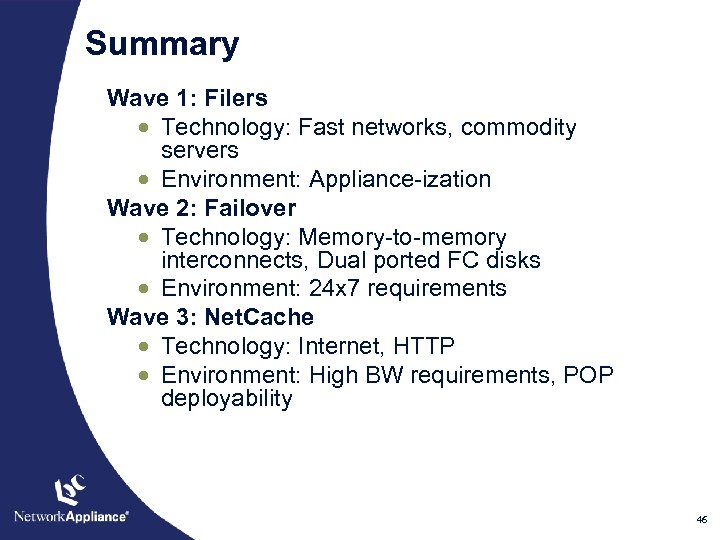 Summary Wave 1: Filers · Technology: Fast networks, commodity servers · Environment: Appliance-ization Wave 2: Failover · Technology: Memory-to-memory interconnects, Dual ported FC disks · Environment: 24 x 7 requirements Wave 3: Net. Cache · Technology: Internet, HTTP · Environment: High BW requirements, POP deployability 46