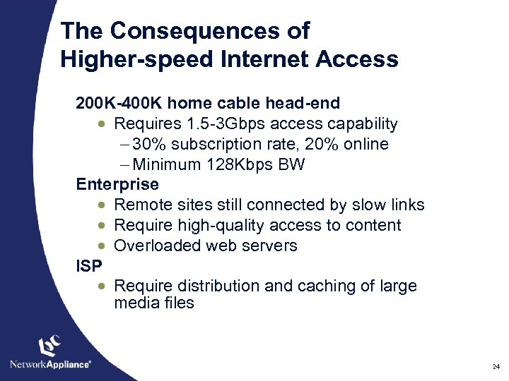 The Consequences of Higher-speed Internet Access 200 K-400 K home cable head-end · Requires 1. 5 -3 Gbps access capability - 30% subscription rate, 20% online - Minimum 128 Kbps BW Enterprise · Remote sites still connected by slow links · Require high-quality access to content · Overloaded web servers ISP · Require distribution and caching of large media files 24