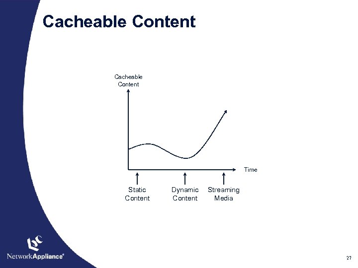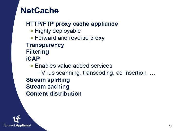 Net. Cache HTTP/FTP proxy cache appliance · Highly deployable · Forward and reverse proxy Transparency Filtering i. CAP · Enables value added services - Virus scanning, transcoding, ad insertion, … Stream splitting Stream caching Content distribution 26