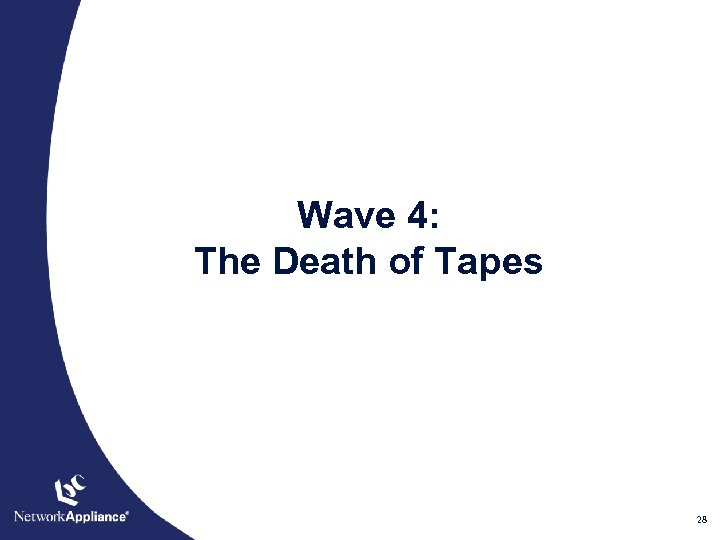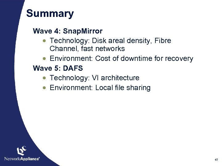 Summary Wave 4: Snap. Mirror · Technology: Disk areal density, Fibre Channel, fast networks · Environment: Cost of downtime for recovery Wave 5: DAFS · Technology: VI architecture · Environment: Local file sharing 47