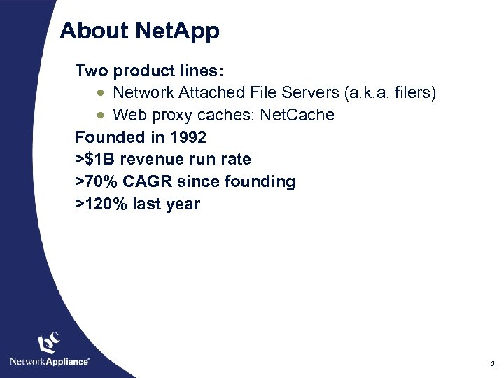 About Net. App Two product lines: · Network Attached File Servers (a. k. a. filers) · Web proxy caches: Net. Cache Founded in 1992 >$1 B revenue run rate >70% CAGR since founding >120% last year 3