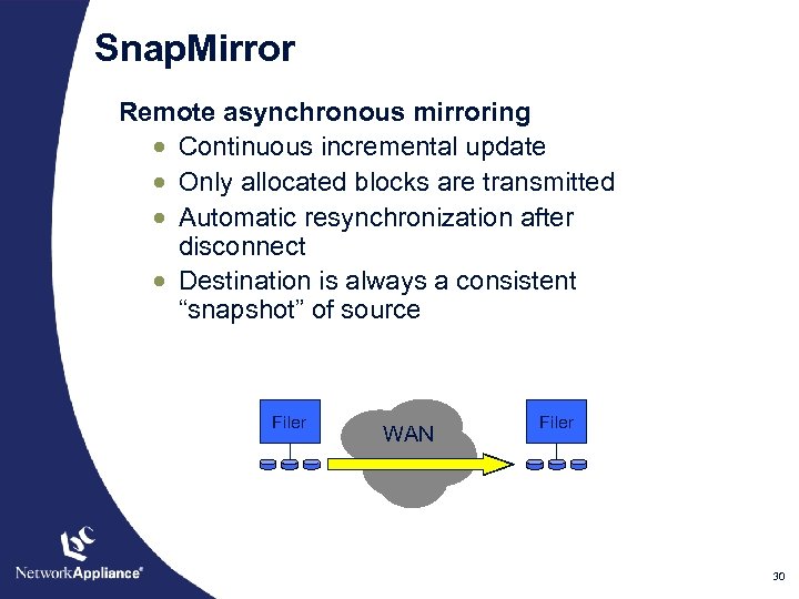 Snap. Mirror Remote asynchronous mirroring · Continuous incremental update · Only allocated blocks are transmitted · Automatic resynchronization after disconnect · Destination is always a consistent “snapshot” of source Filer WAN Filer 30