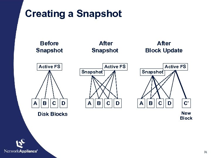 Creating a Snapshot Before Snapshot After Snapshot Active FS Snapshot A B C After Block Update D Disk Blocks A B Active FS Snapshot C D A B C D C’ New Block 31