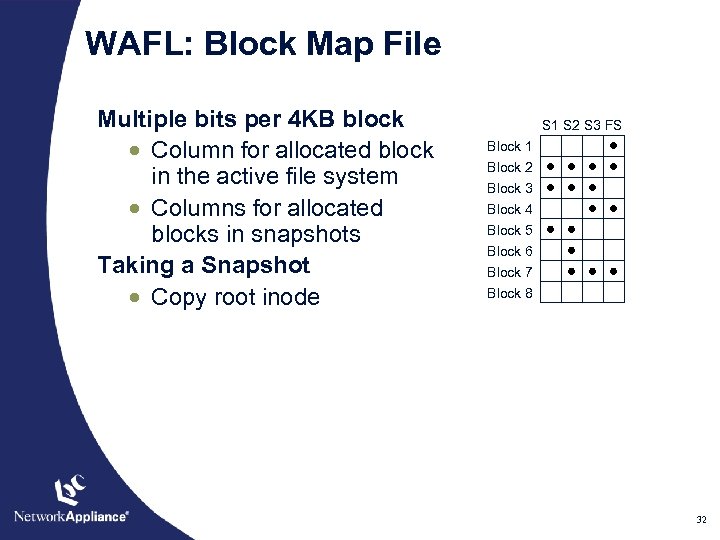 WAFL: Block Map File Multiple bits per 4 KB block · Column for allocated block in the active file system · Columns for allocated blocks in snapshots Taking a Snapshot · Copy root inode S 1 S 2 S 3 FS Block 1 Block 2 Block 3 Block 4 Block 5 Block 6 Block 7 Block 8 32