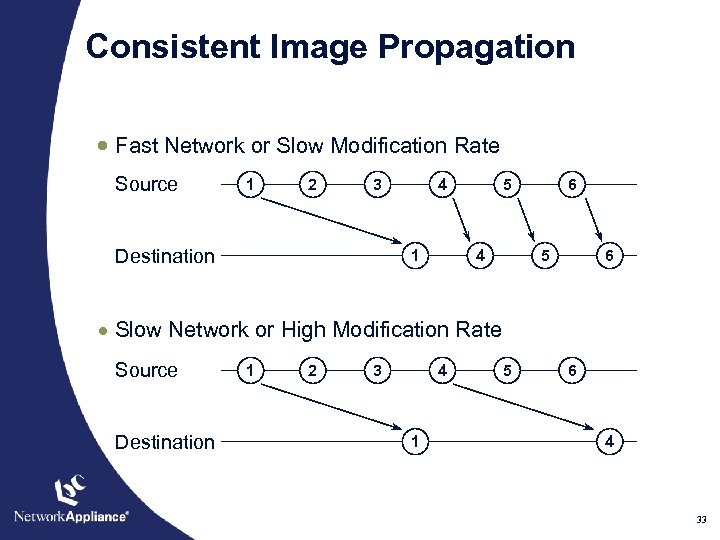 Consistent Image Propagation · Fast Network or Slow Modification Rate Source 1 2 3 Destination 4 1 5 4 6 5 6 · Slow Network or High Modification Rate Source Destination 1 2 3 4 1 5 6 4 33