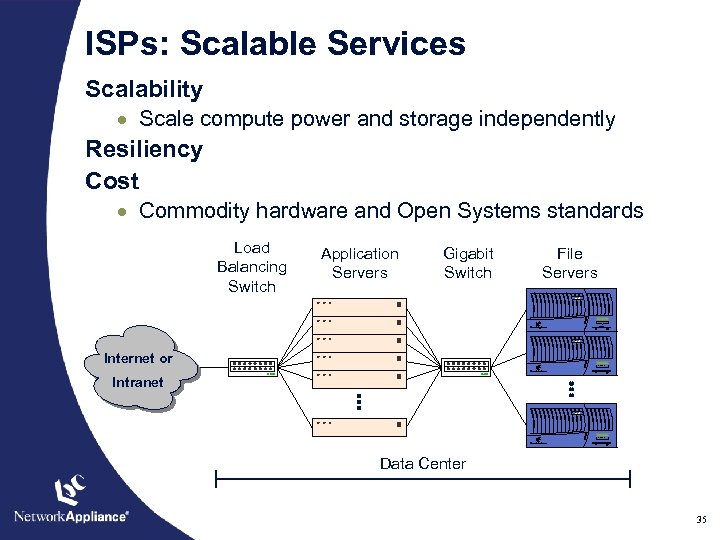 ISPs: Scalable Services Scalability · Scale compute power and storage independently Resiliency Cost · Commodity hardware and Open Systems standards Load Balancing Switch Application Servers Gigabit Switch File Servers F 760 Internet or Intranet F 760 Data Center 35
