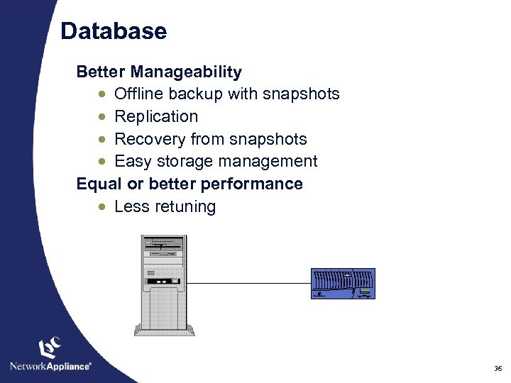 Database Better Manageability · Offline backup with snapshots · Replication · Recovery from snapshots · Easy storage management Equal or better performance · Less retuning F 760 36