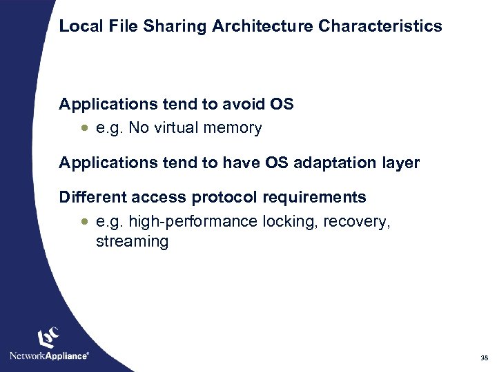 Local File Sharing Architecture Characteristics Applications tend to avoid OS · e. g. No virtual memory Applications tend to have OS adaptation layer Different access protocol requirements · e. g. high-performance locking, recovery, streaming 38