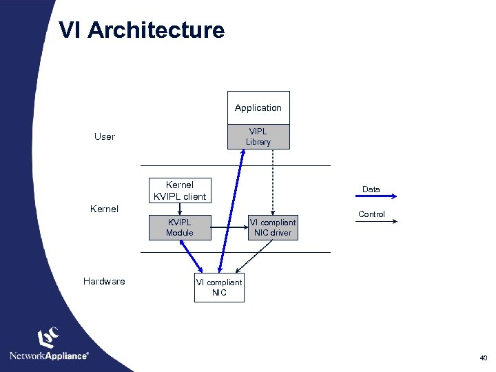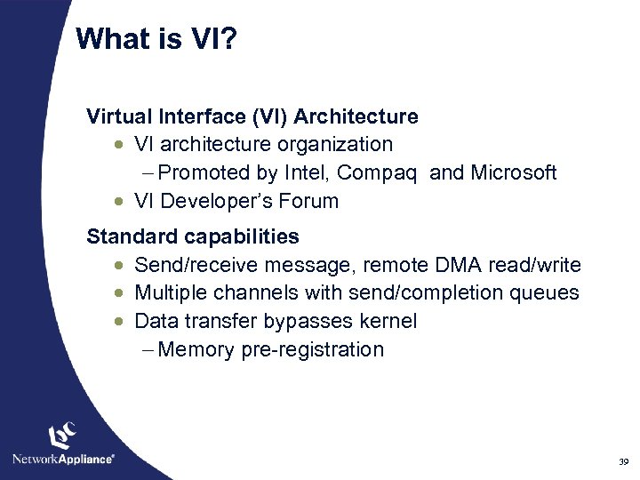 What is VI? Virtual Interface (VI) Architecture · VI architecture organization - Promoted by Intel, Compaq and Microsoft · VI Developer’s Forum Standard capabilities · Send/receive message, remote DMA read/write · Multiple channels with send/completion queues · Data transfer bypasses kernel - Memory pre-registration 39