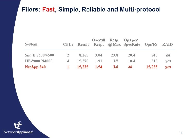 Filers: Fast, Simple, Reliable and Multi-protocol System Sun E 3500/4500 HP-9000 N 4000 Net. App 840 CPUs 2 4 1 Overall Resp. Ops per Result Resp. @ Max Spec. Rate 8, 165 15, 270 15, 235 3. 04 1. 91 1. 54 23. 8 3. 7 3. 6 20. 4 10. 4 46 Ops/FS RAID 340 318 15, 235 no yes 4