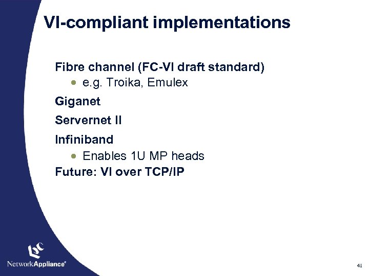 VI-compliant implementations Fibre channel (FC-VI draft standard) · e. g. Troika, Emulex Giganet Servernet II Infiniband · Enables 1 U MP heads Future: VI over TCP/IP 41