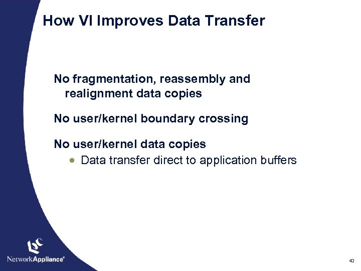 How VI Improves Data Transfer No fragmentation, reassembly and realignment data copies No user/kernel boundary crossing No user/kernel data copies · Data transfer direct to application buffers 42