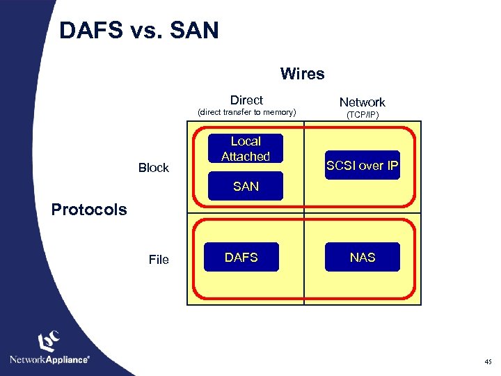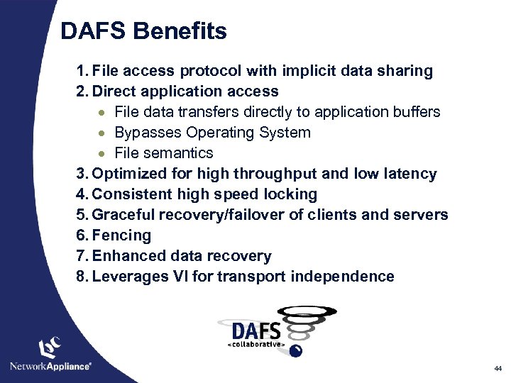 DAFS Benefits 1. File access protocol with implicit data sharing 2. Direct application access · File data transfers directly to application buffers · Bypasses Operating System · File semantics 3. Optimized for high throughput and low latency 4. Consistent high speed locking 5. Graceful recovery/failover of clients and servers 6. Fencing 7. Enhanced data recovery 8. Leverages VI for transport independence 44